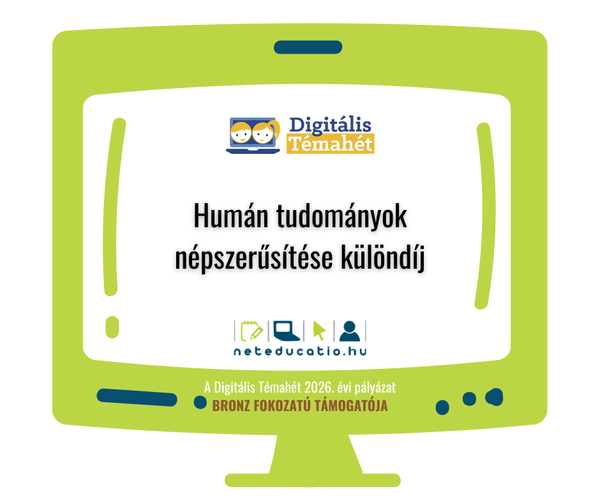 A Neteducatio.hu a Digitális Témahét 2026. évi pályázat bronz fokozatú támogatója különdíjat hirdet azon csatlakozó intézmények pedagógusai számára, akik olyan pedagógiai projekteket valósítanak meg, amelyek alkalmasak arra, hogy a rendelkezésre álló digitális eszközök segítségével a humán tudományokat népszerűsítsék az új generációs tanulók között.